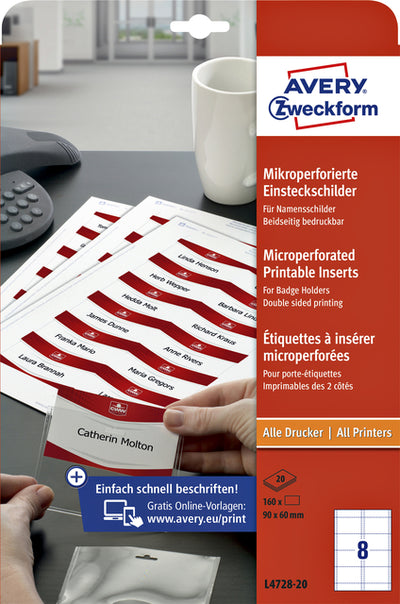 Carte badge Avery L4728-20 microperforation 60x90mm