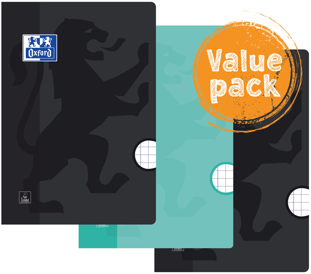 * Un pack discount contenant trois carnets A4 Oxford, quadrillé 10mm, deux noirs et un turquoise.