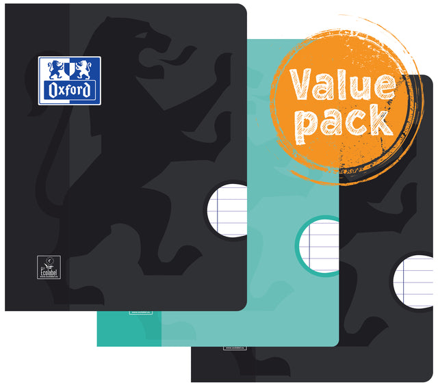 * Un pack discount contenant trois cahiers A5 Oxford, lignés, deux noirs et un turquoise.