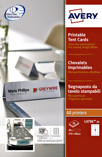 Plaque signalétique de table Avery L4796-20 210x60mm blanc 20 pièces