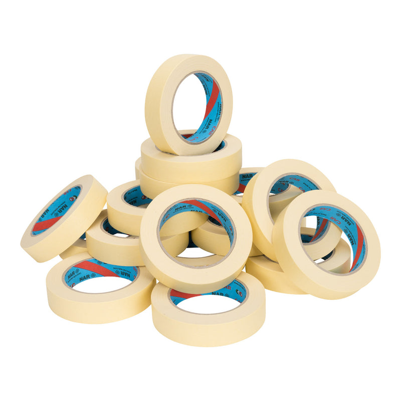 Afplaktape, ook wel bekend als schilderstape of masking tape, is een ideale tool voor spuiterijen, schilder- en stucwerk. Met deze tape kunt u gemakkelijk randen afplakken die niet meegenomen moeten worden tijdens het schilderen of spuiten. Daarnaast kunt u in combinatie met pakpapier of afdekfolie ook grotere oppervlakken afdekken. Onze afplaktape is van het gerenommeerde merk NAR en exclusief verkrijgbaar bij VIV in Nederland. Het is gemaakt van licht gecrêpt papier met een lijmlaag van natuurrubber, waardoor het van hoge kwaliteit is. De tape is hittebestendig, bestand tegen oplosmiddelen en vochtige omgevingen, en laat geen lijmresten achter bij het verwijderen. Met een rolbreedte van 25 millimeter en een totale rollengte van 50 meter is deze geel-beige gekleurde masking tape een handig hulpmiddel voor diverse toepassingen."