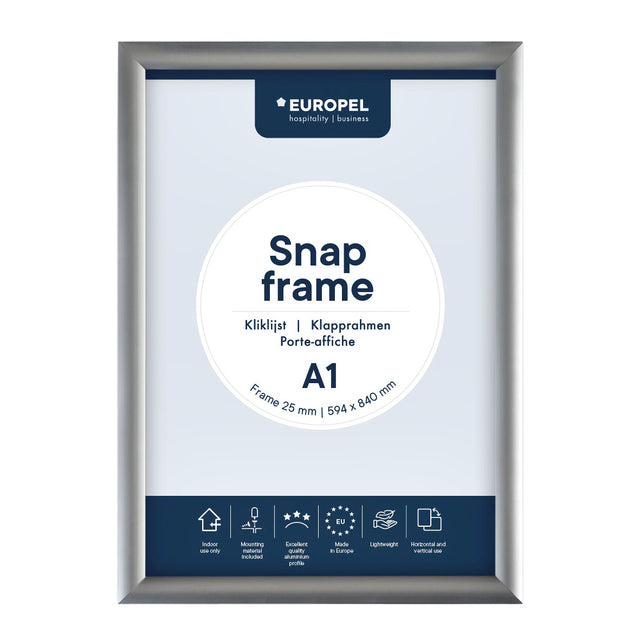 Met de Europel 355013 A1 kliklijst heb je de perfecte manier gevonden om je boodschap op een professionele en stijlvolle manier te presenteren. Dankzij het handige Easy-Click systeem kun je snel en eenvoudig informatie, posters of afbeeldingen plaatsen en wisselen, zonder je ...MeerMet de Europel 355013 A1 kliklijst heb je de perfecte manier gevonden om je boodschap op een professionele en stijlvolle manier te presenteren. Dankzij het handige Easy-Click systeem kun je snel en eenvoudig informatie, posters of afbeeldingen plaatsen en wisselen, zonder je zorgen te maken over beschadiging van je materiaal. Onze kliklijst is vervaardigd uit hoogwaardige materialen en heeft een mooie luxe look dat past in elke omgeving. Het frame is gemaakt van geanodiseerd aluminium met een kunststof achterzijde, waardoor het stevig en duurzaam is. Het eenvoudige klikmechanisme maakt het gemakkelijk om de lijst te openen en je documenten te plaatsen, terwijl het robuuste frame je materiaal veilig op zijn plaats houdt. De heldere, transparante ontspiegelde voorzetfolie beschermt je poster tegen vuil en vocht. Onze kliklijst heeft veel voordelen, waaronder: Gemakkelijk wisselen van documenten Het Easy-Click systeem waarmee je snel en eenvoudig je presentatie kunt maken. Strakke en moderne uitstraling De verstekhoek in het profiel van de lijst, samen met de zilvere look, zorgt voor een strakke en moderne uitstraling. De documenten zijn altijd beschermd en leesbaar De heldere, transparante ontspiegelde voorzetfolie beschermt je poster tegen vuil en vocht, terwijl het zorgt voor een heldere en scherpe weergave van je boodschap. Multifunctioneel Onze kliklijst is veelzijdig in gebruik, omdat je deze zowel horizontaal als verticaal kunt ophangen. Dit maakt het mogelijk om je boodschap op verschillende manieren te presenteren, afhankelijk van de ruimte en de omgeving waarin je de lijst plaatst. Snel en eenvoudig in gebruik De Europel kliklijst is gemakkelijk te bevestigen aan de muur, waardoor deze snel en eenvoudig te gebruiken is. Het bijgeleverde bevestigingsmateriaal, waaronder vier schroeven en vier pluggen, maakt het mogelijk om de lijst veilig aan de muur te bevestigen. Hierdoor kun je de kliklijst direct gebruiken en je boodschap op een professionele en stijlvolle manier presenteren. Europel heeft daarnaast verschillende kliklijsten in het assortiment. Zit de juiste kliklijst er niet bij? Neem dan contact met ons op zodat we de maatwerk opties kunnen bespreken. Overige