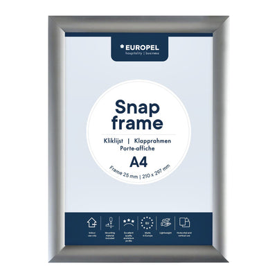 : Een snap frame van geanodiseerd aluminium met een kunststof achterzijde en helder transparant ontspiegeld voorzetfolie. Dit frame heeft een profiel van 25mm en is eenvoudig te monteren dankzij het Easy-Click-systeem. Het frame zorgt voor een snelle, eenvoudige en representatieve presentatie van uw inhoud.