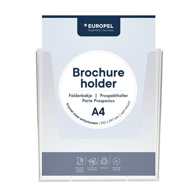 - Folderbakje voor een glasheldere presentatie aan de wand van folders, catalogi en prijskaarten.